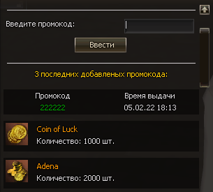| № | Промокод | Сервер | Время | Статус |